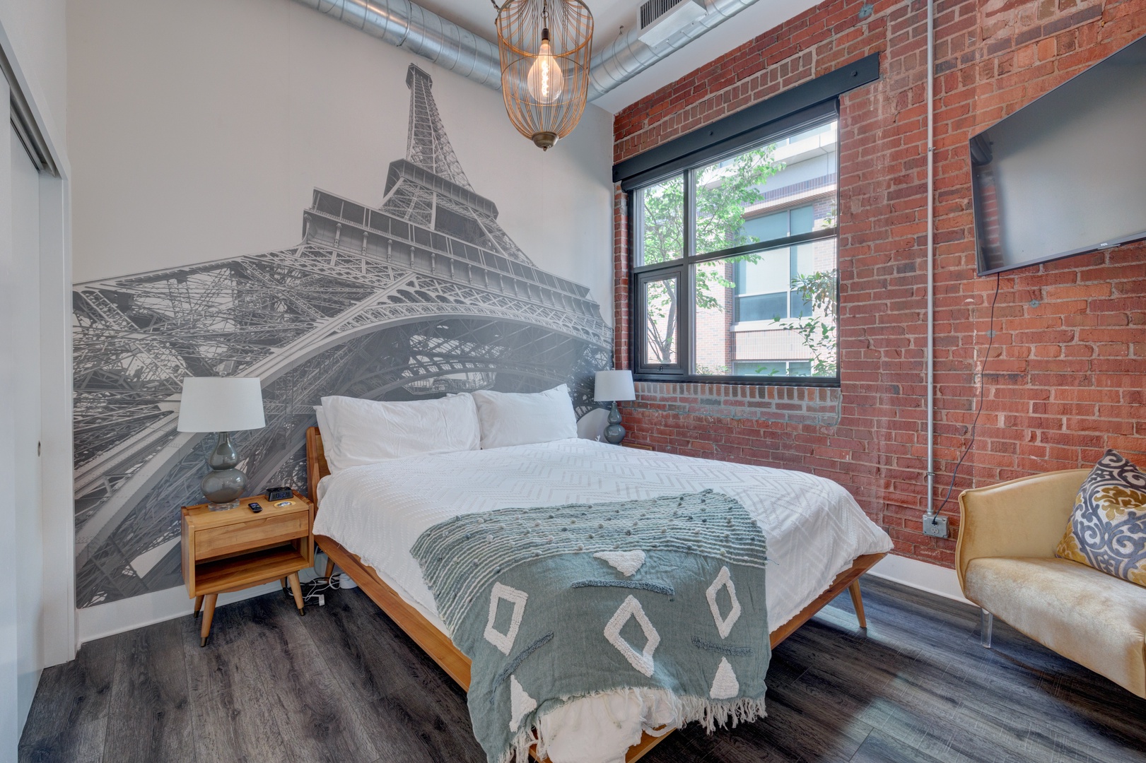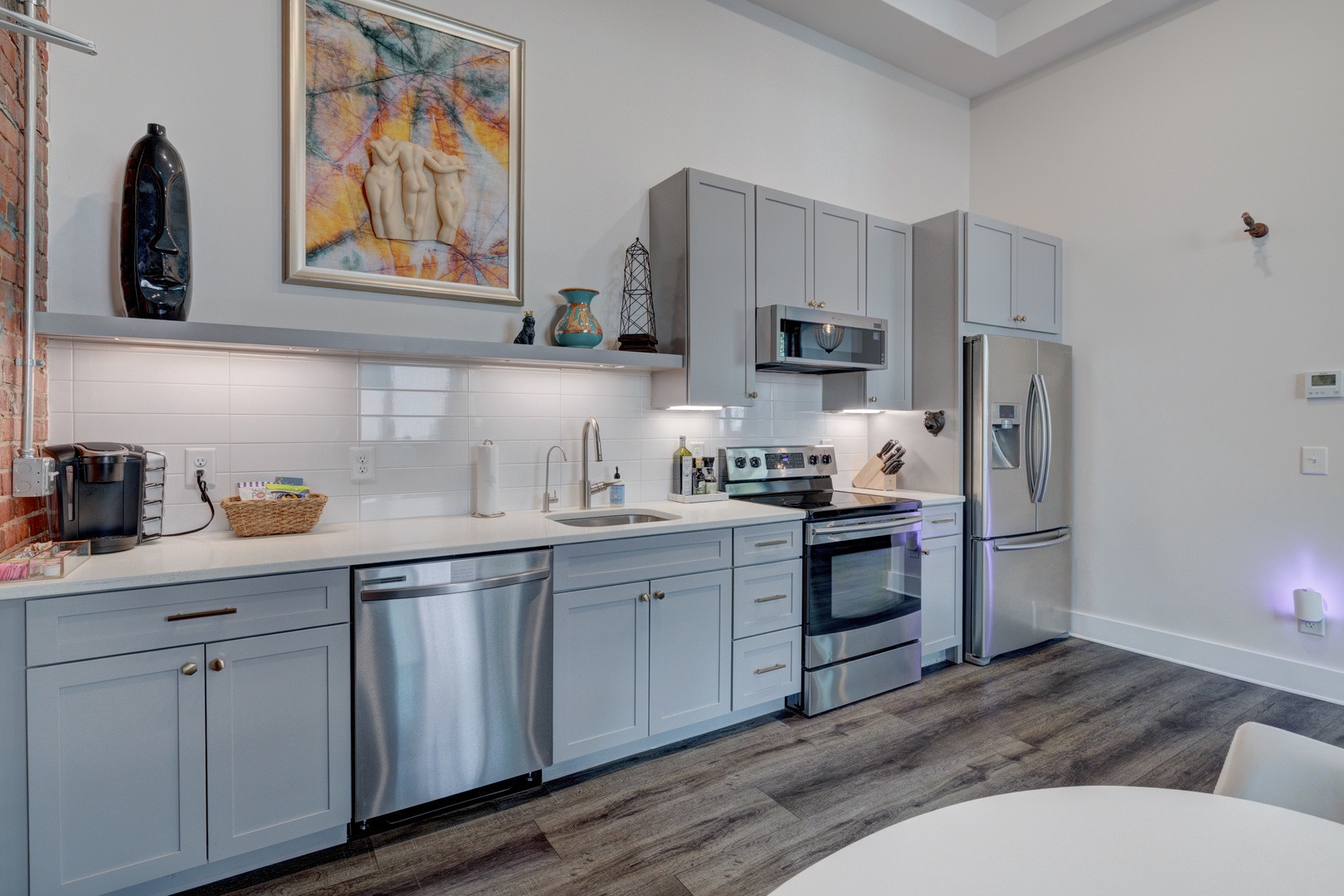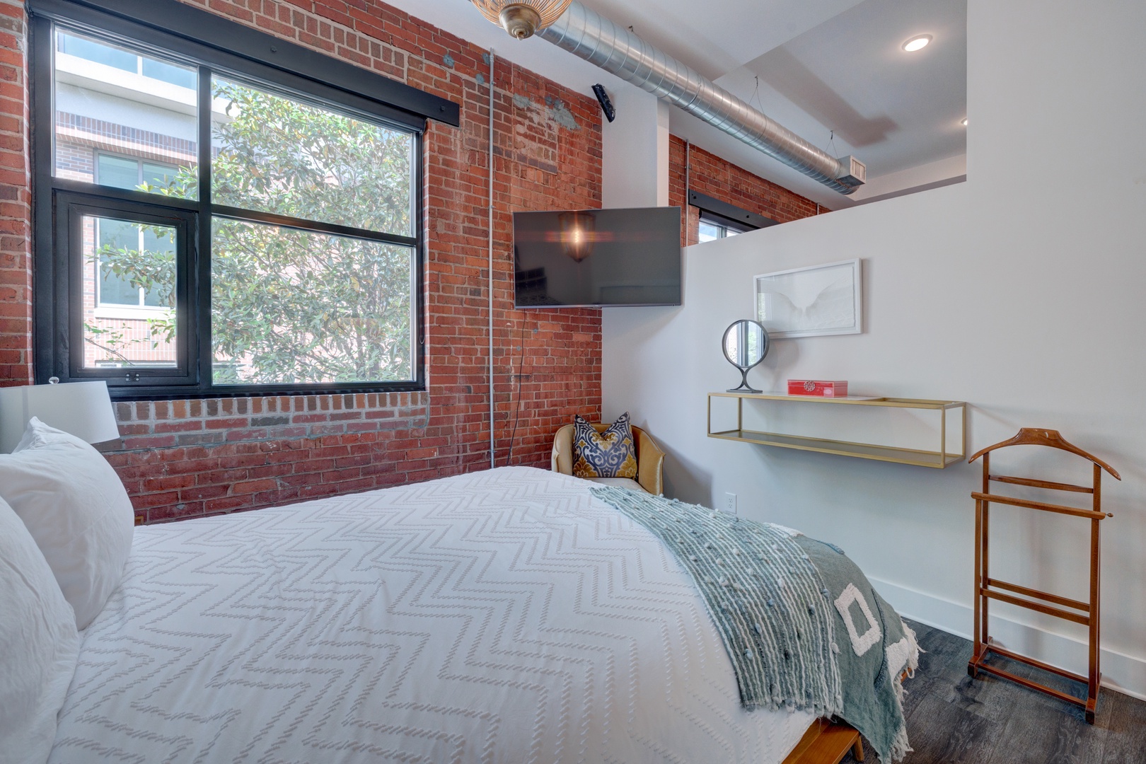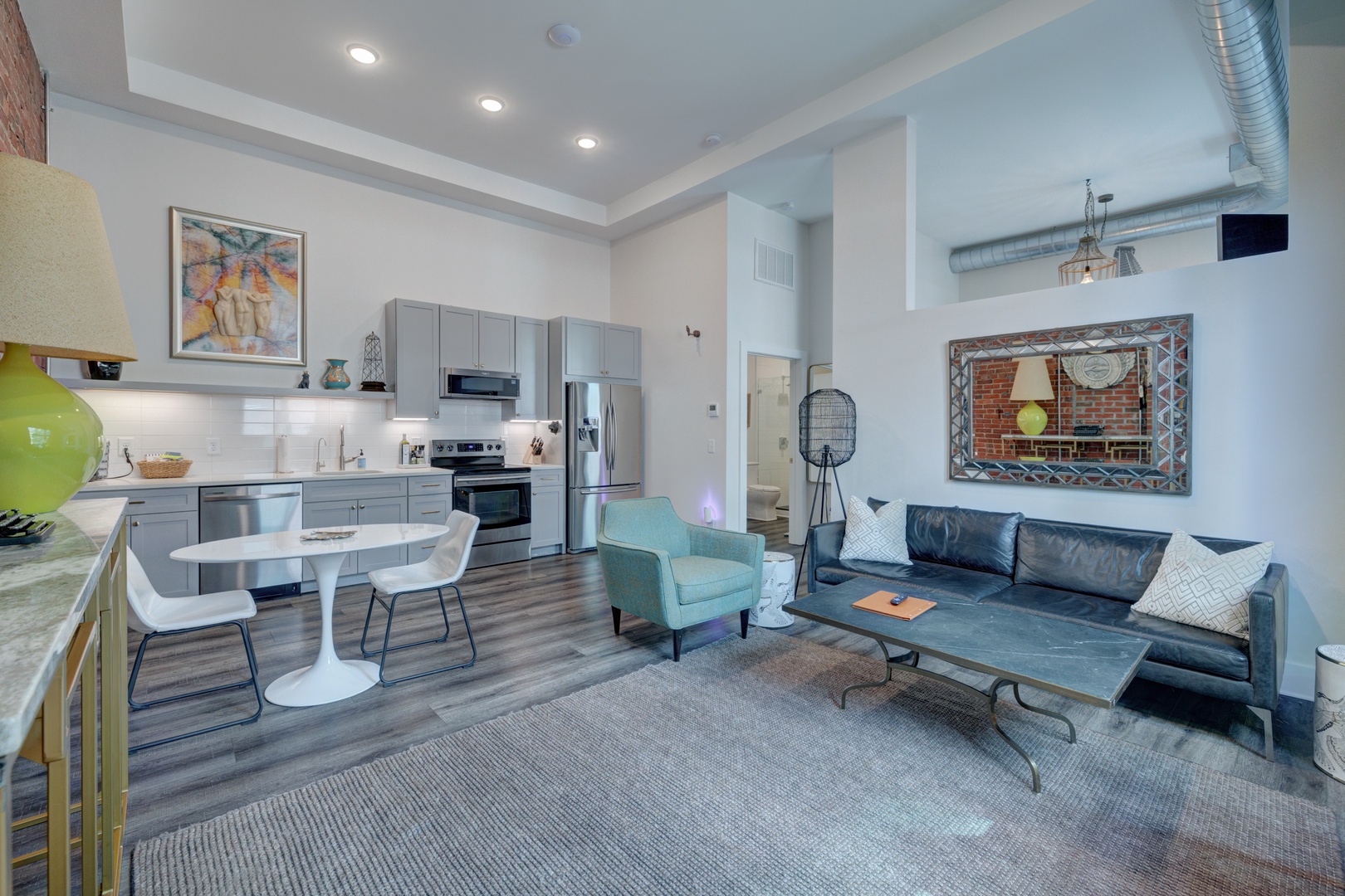 The crรจme de le crรจme suite at the beautiful boutique hotel, The Hive. No details were spared in this luxury king suite featuring original exposed brick walls, high 12ft ceilings, a modern kitchen with beautiful quartz countertops and stainless steel appliances and dining table, and an inviting living room with 8 ft. windows, leather sofa, and original art throughout! From the large walk-in shower, to the luxury linens and towels, and high-end Charles P. Rogers king mattress, every detail has been meticulously curated in this suite to enhance the guest experience and provide a sense of indulgence and relaxation.