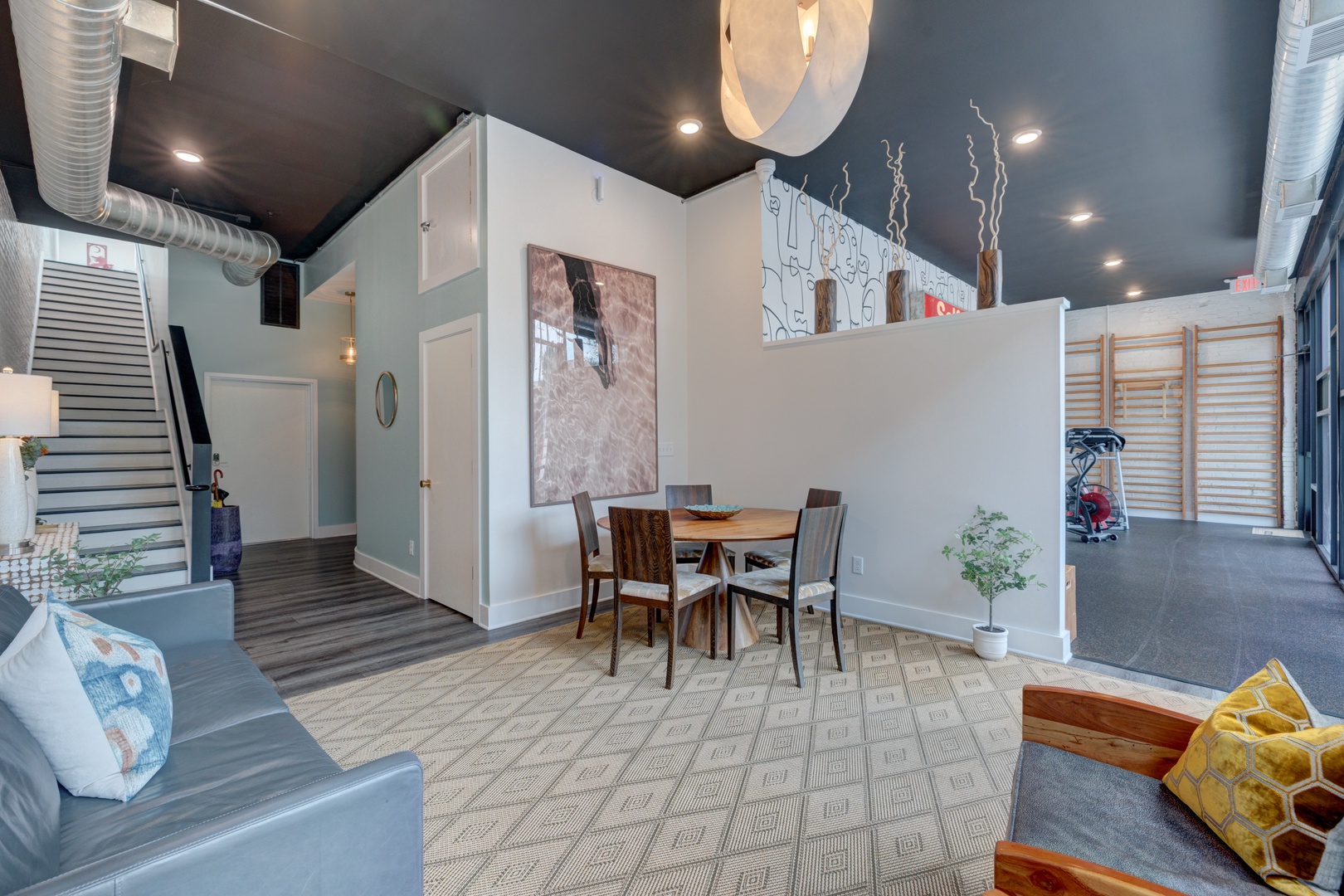 This pet friendly king suite with a balcony has large windows, visually captivating decor and original art, high ceilings, a beautiful full kitchen with quartz countertops and stainless steel appliances, comfortable living room and dining area, a large walk-in shower, and luxury linens. Together, the hip decor and art transform this suite into a visually captivating and engaging space to relax, providing guests with an immersive and memorable experience that goes beyond mere accommodation.