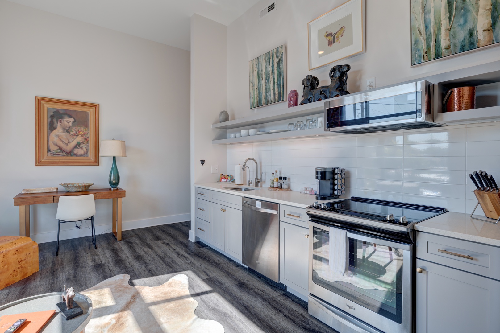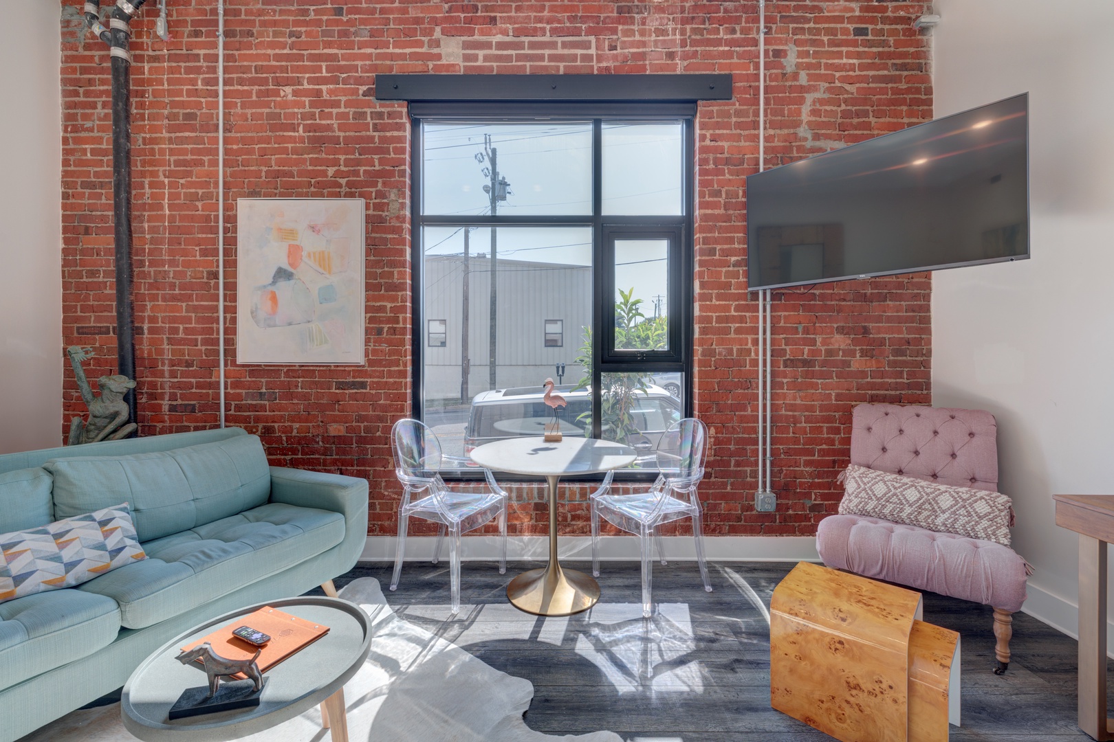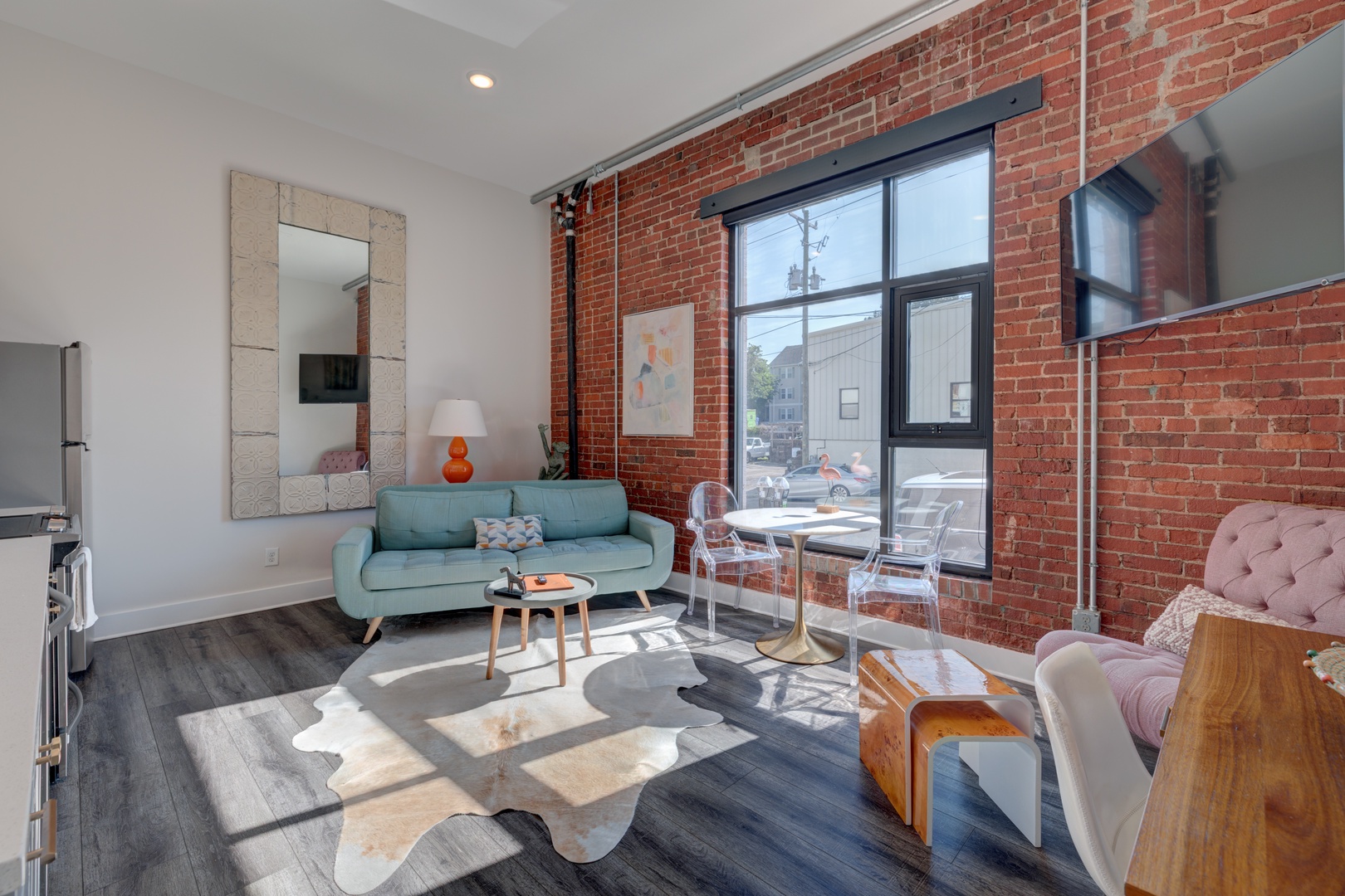 The crรจme de le crรจme suite at the beautiful boutique hotel, The Hive. No details were spared in this luxury king suite featuring original exposed brick walls, high 12ft ceilings, a modern kitchen with beautiful quartz countertops and stainless steel appliances and dining table, and an inviting living room with 8 ft. windows, leather sofa, and original art throughout! From the large walk-in shower, to the luxury linens and towels, and high-end Charles P. Rogers king mattress, every detail has been meticulously curated in this suite to enhance the guest experience and provide a sense of indulgence and relaxation.