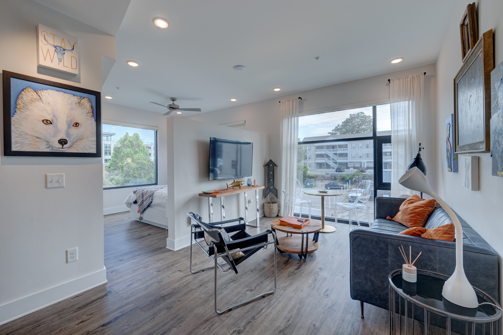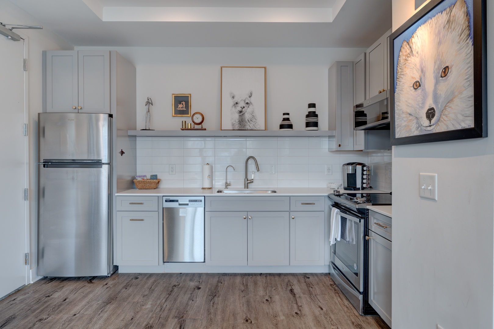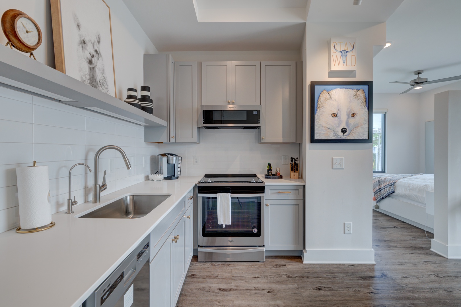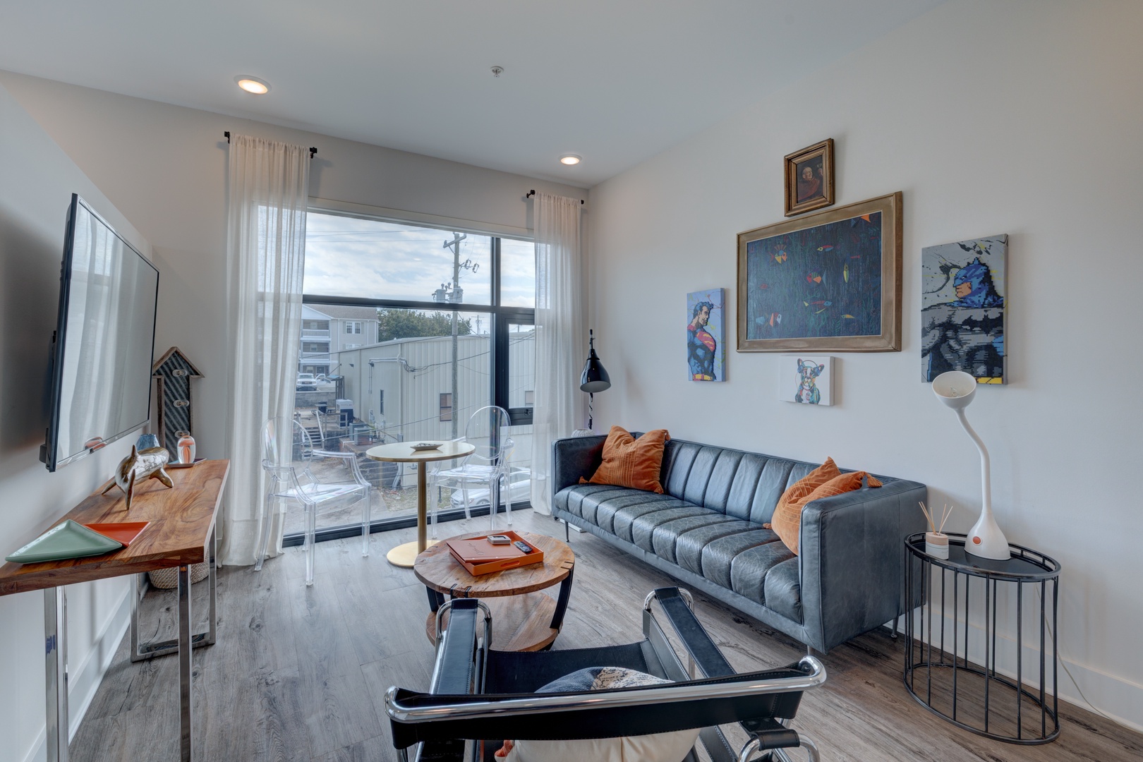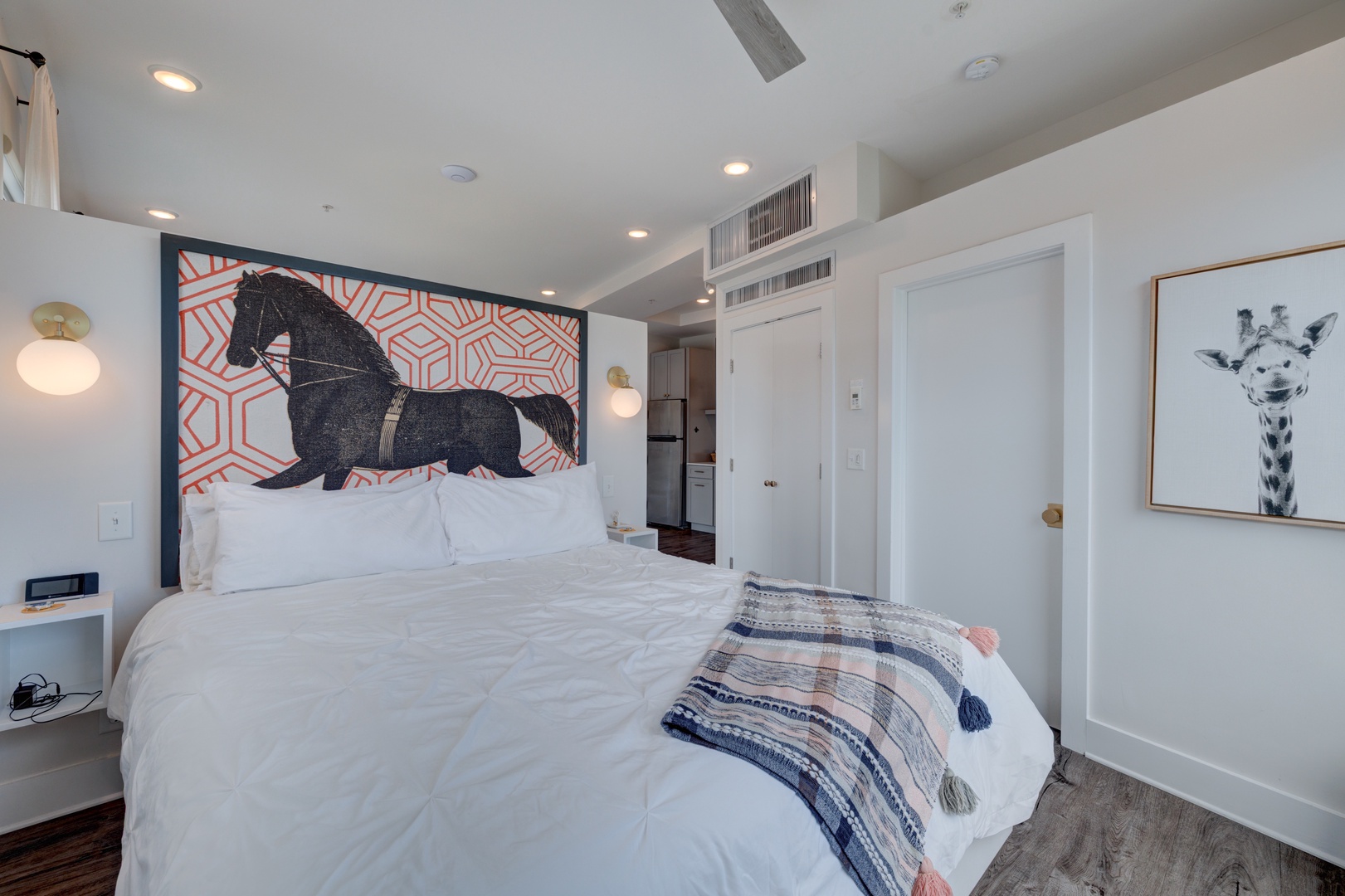 This uniquely curated king suite has large windows, visually captivating decor and original art, high ceilings, a beautiful full kitchen with quartz countertops and stainless steel appliances, comfortable living room and dining area, a large walk-in shower, and luxury linens. Together, the hip decor and art transform this suite into a visually captivating and engaging space to relax, providing guests with an immersive and memorable experience that goes beyond mere accommodation.