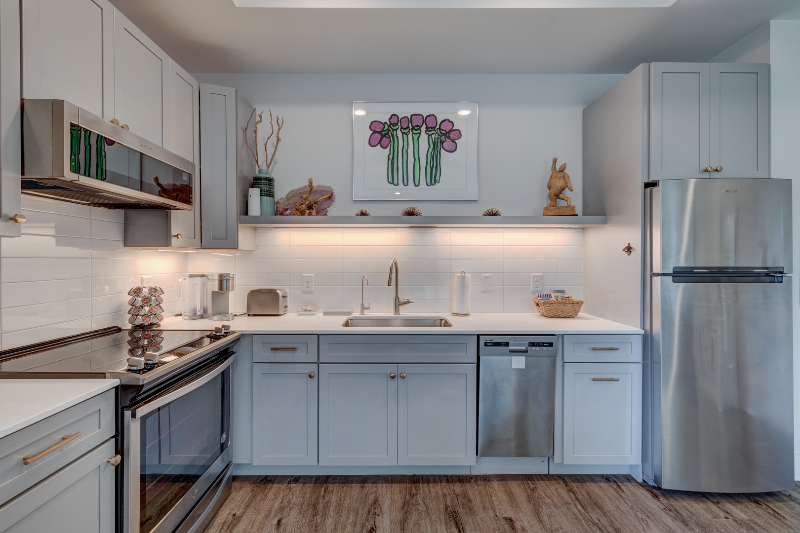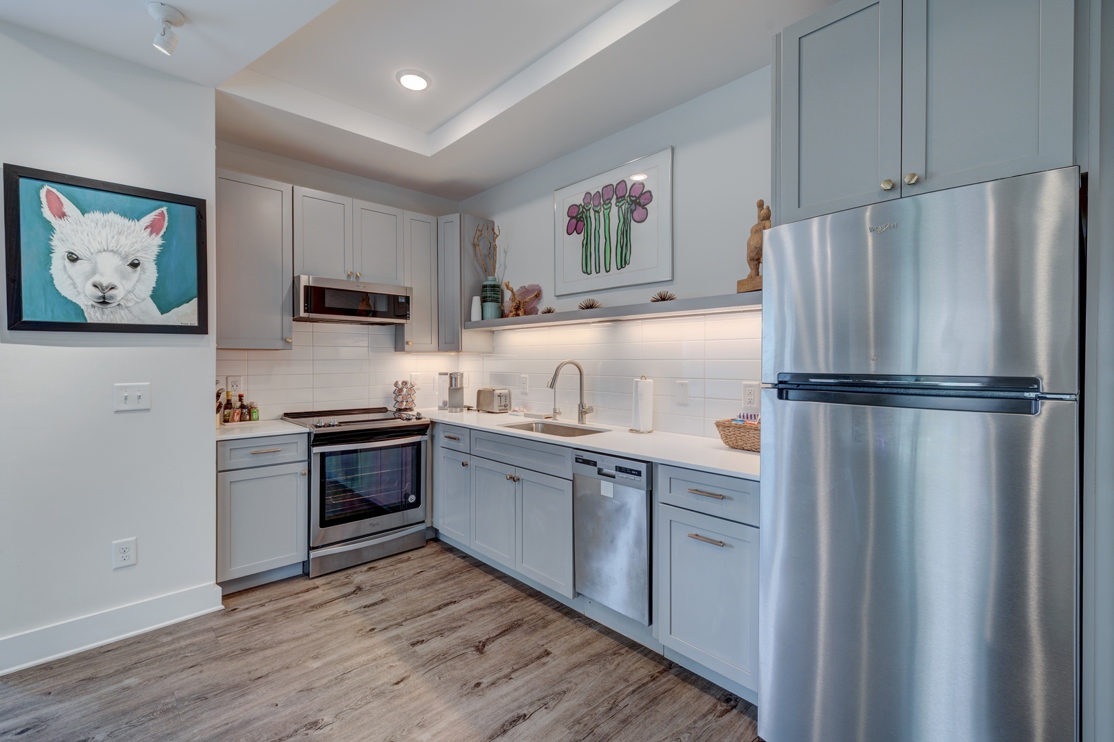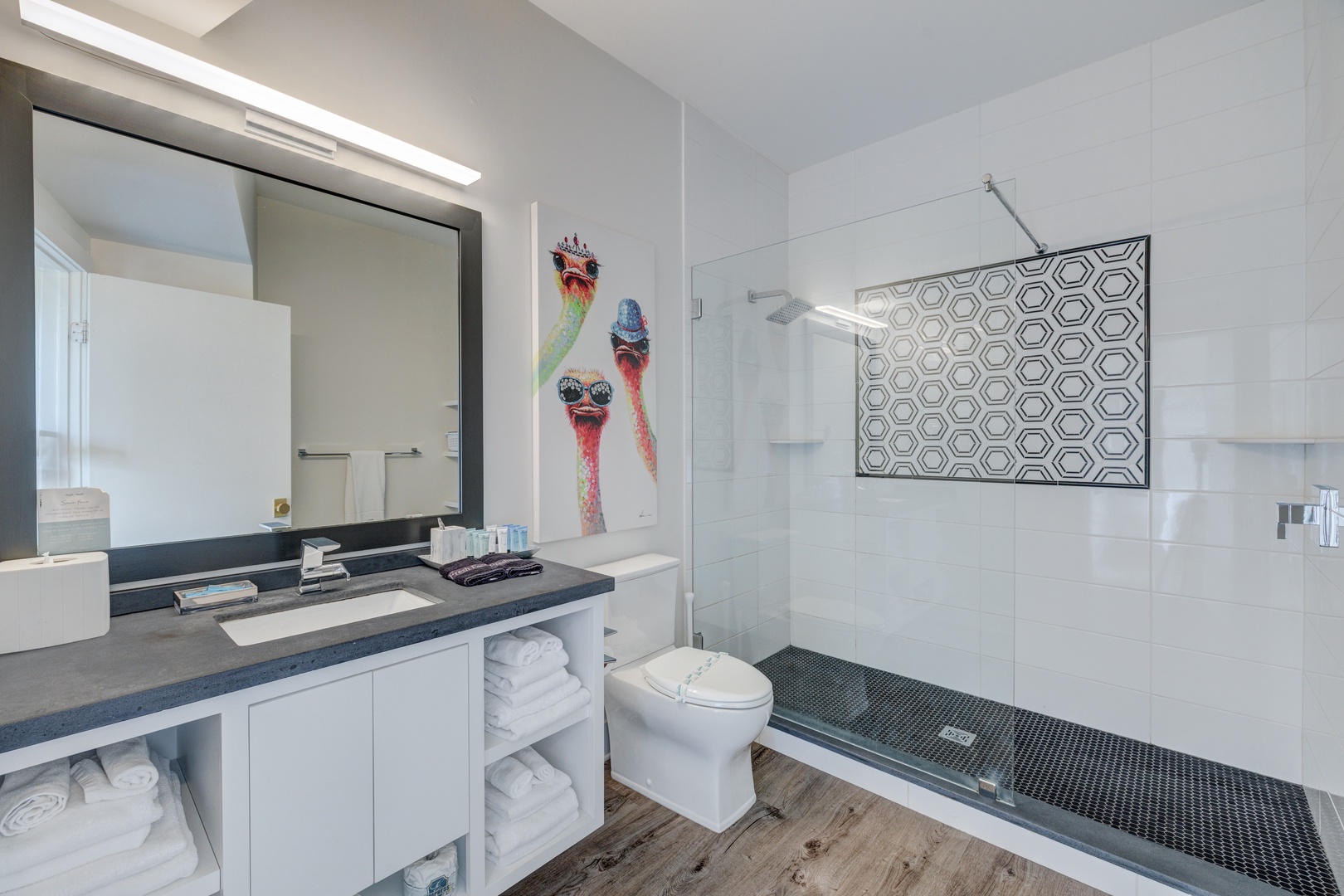 This luxury king bedroom suite with balcony has large windows, visually captivating decor and original art, high ceilings, a beautiful full kitchen with quartz countertops and stainless steel appliances and dining table for 2. The meticulously curated living room has a leather sleeper sofa with memory foam mattress and unique decor throughout! The spacious and luxurious bathroom boasts a large walk-in shower! Together, the hip decor and art transform this suite into a visually captivating and engaging space to relax, providing guests with an immersive and memorable experience that goes beyond mere accommodation.
