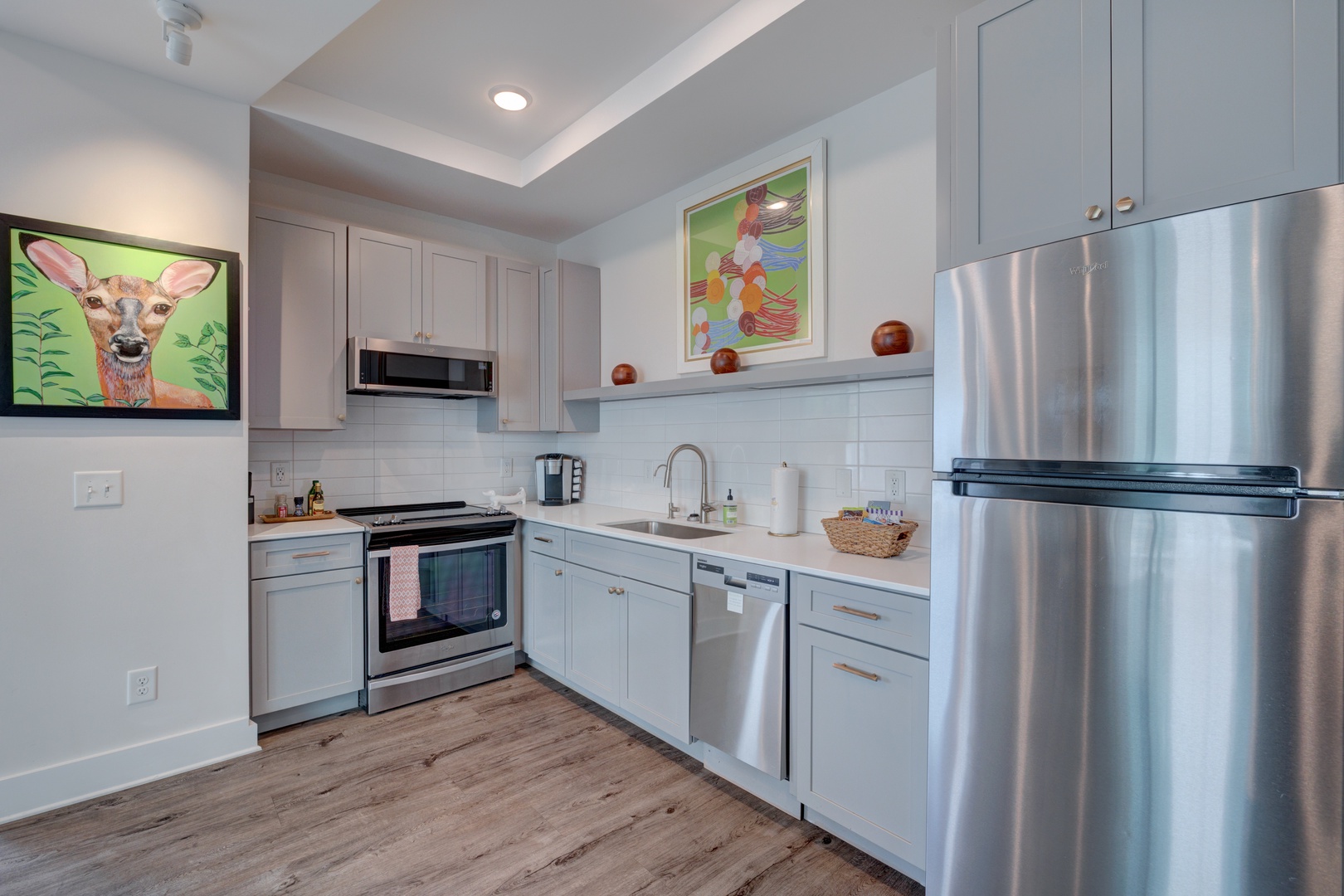 Our spacious 3rd floor adjacent suite listing offers a total of 1,200 sq ft of modern open living space. This listing is for two suites directly adjacent to one another. Each king suite offers their own uniquely curated design with high ceilings, large windows, beautiful kitchens with quartz countertops and stainless steel appliances, comfortable living rooms and dining areas, large walk-in showers, and luxury linens. Together, the hip decor and art transform these suites into visually captivating and engaging spaces for you to relax, providing guests with an immersive and memorable experience that goes beyond mere accommodation.